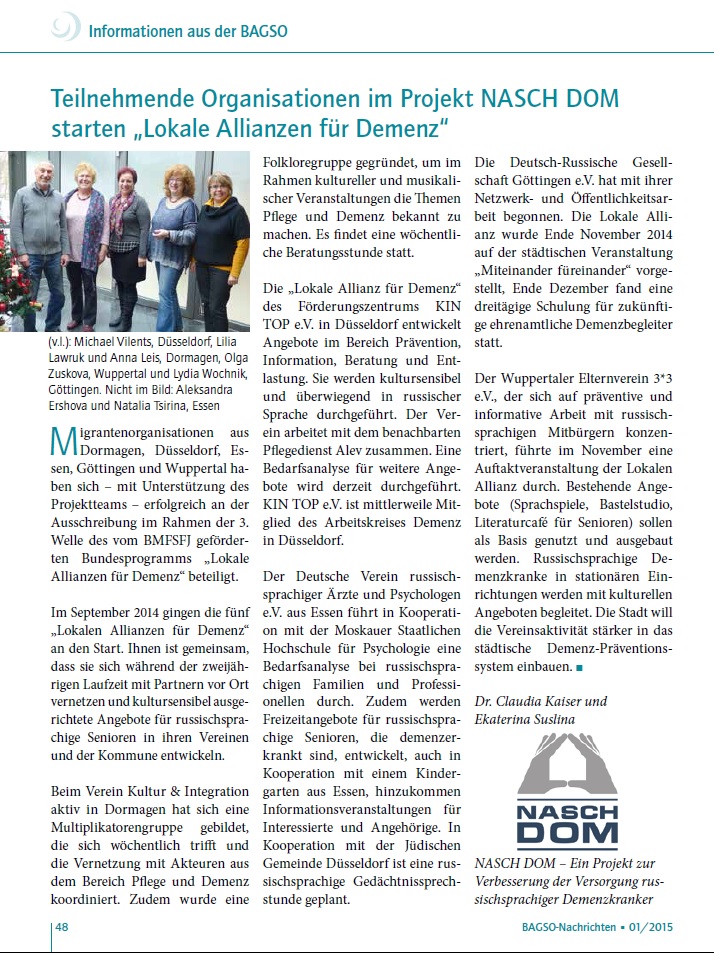 In der aktuellen Ausgabe der BAGSO-Nachrichten 01/2015 wird unter anderem über die erfolgreiche Beteiligung der 5 teilnehmenden Organisationen im Projekt NASCH DOM an der Ausschreibung im Rahmen der 3. Welle des vom BMFSFJ geförderten Bundesprogramms „Lokale Allianzen für Demenz“ berichtet. Wir, als Team des Projektes NASCH DOM, freuen uns sehr für die Teilnehmer und wünschen Ihnen weiterhin viel Erfolg in ihrer Arbeit.